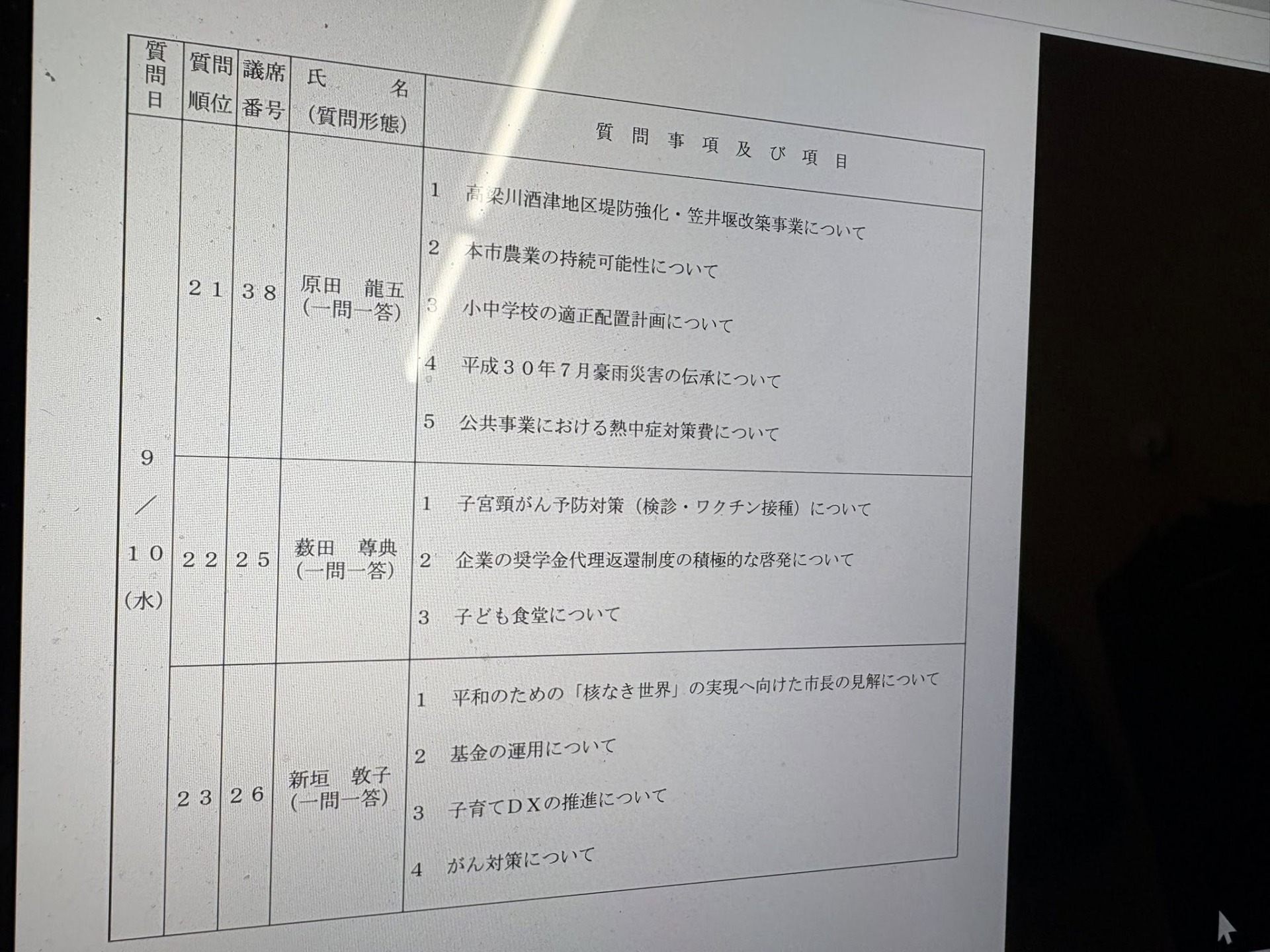 議会質問最終日 活動報告 2025-09-10 議会質問最終日でした。 未来クラブ からは、原田龍五 議員さんが登壇されました。 真備町のことを詳しく質問されました。 今日で議会質問は、全て終了しました。