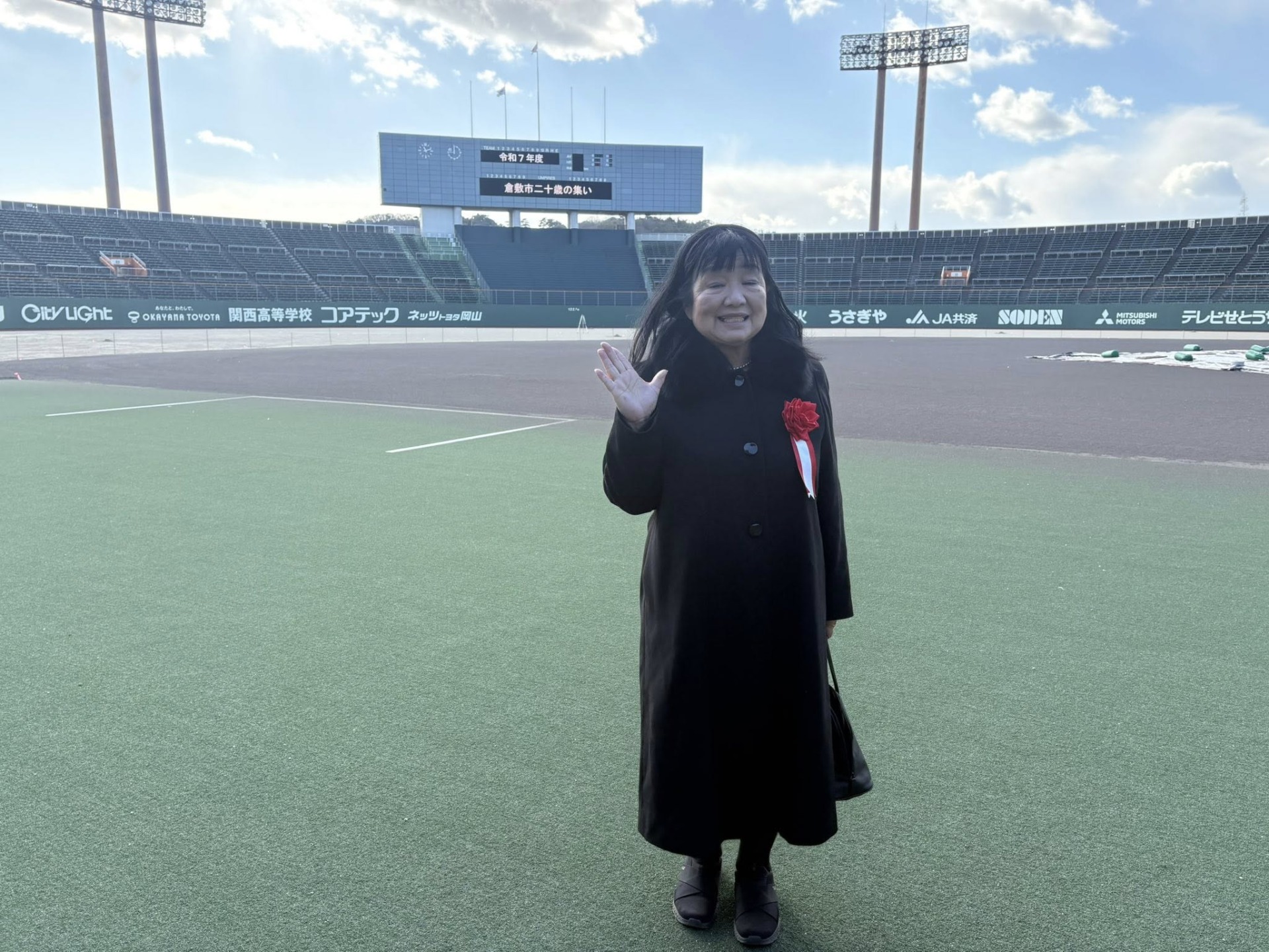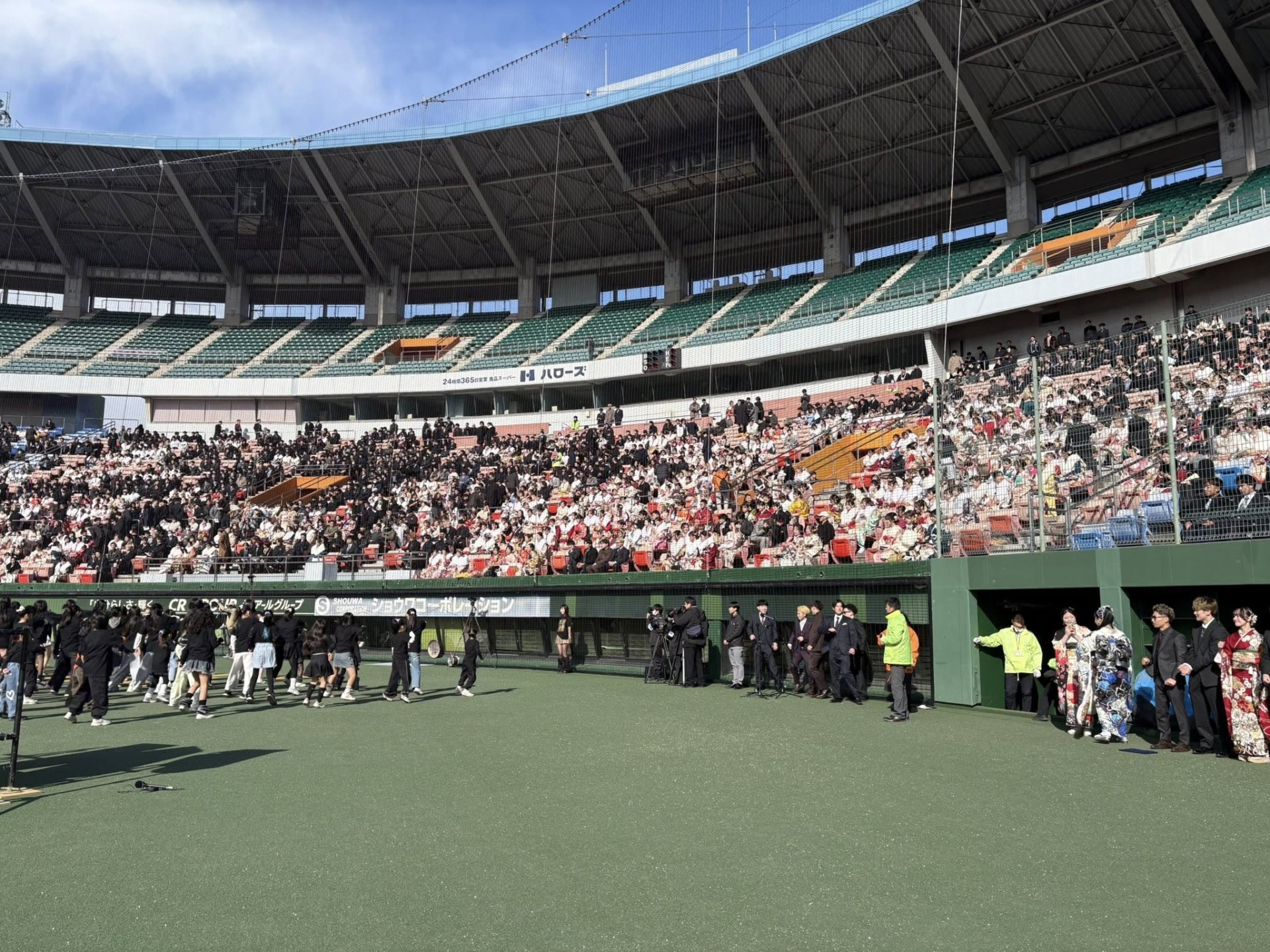 その後、直ぐに、倉敷マスカット球場に向かいました。振袖を綺麗に着こなされたり、皆さん綺麗に華やかでした。